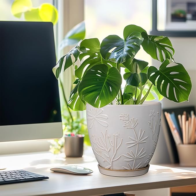 - Stylish Appearance: Our ceramic planter has a white main colour, a beautiful embossed petal and leaf pattern on the surface, elegant appearance making it ideal for home decor, garden decor and office decor