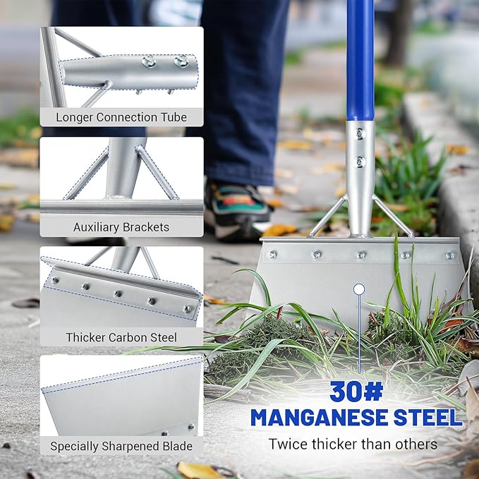 - Multipurpose Cleaning: This flat shovel has a sharp and sturdy straight blade, which can be easily used in a variety of scenarios. Such as removing weeds and moss in the garden, shoveling away dirt in the patio, shoveling creepers off the wall, edging the walkway, and can be used to shovel ice in winter.