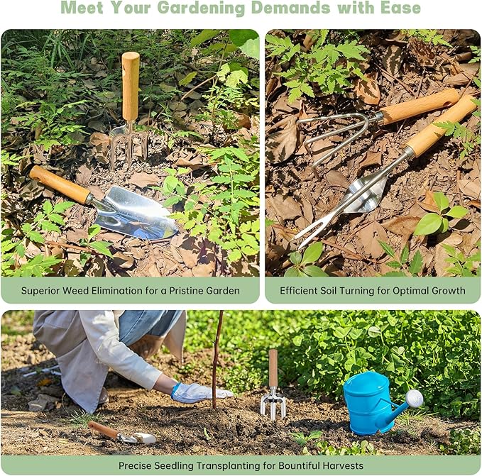 • Heavy-duty gardening tool kit:Is made of high-strength stainless steel, which is sturdy and durable and has extremely strong rust and corrosion resistance. Besides, during use, the tools hardly deform or break and can efficiently deal with any challenges in gardening work.