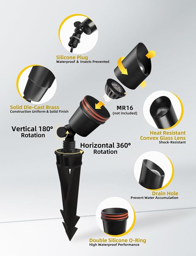 - FLEXIBLE INSTALLATION: Our low voltage up lights outdoor features a cleated heavy-duty stake design, making it easy to mount on the ground. Additionally, there is a screw for adjustment in the middle of the spotlight, allowing you to rotate the outdoor spotlights for yard up to 180° in the vertical direction. These Brass landscaping lights offer a 360° horizontal rotation by adjusting the ground stake. Allows you to illuminate any angle you want without even moving the fixture.