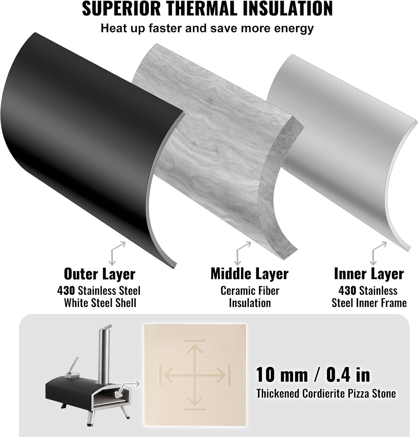 - π Durable Construction: VEVOR pizza oven withstands outdoor conditions and frequent use. Adopted a 3-layer design, promoting efficient heat circulation. Featuring a 430 stainless steel shell, and thick insulation cotton, it ensures durability and excellent heat retention