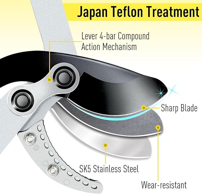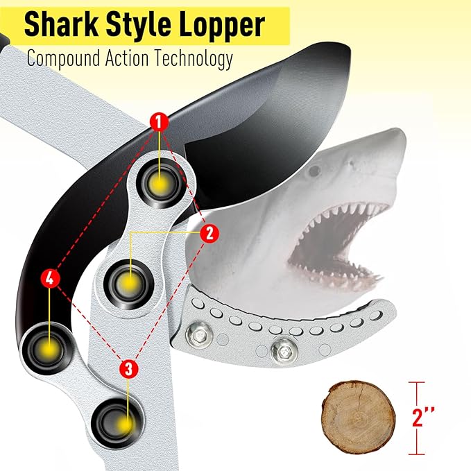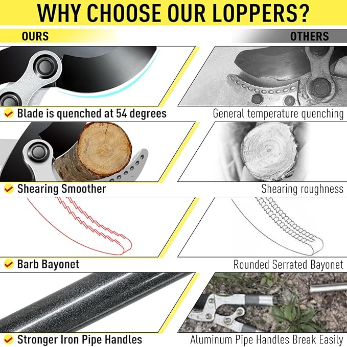 - ERGONOMIC DESIGN: The loppers for tree trimming heavy duty with compound action design, it effortlessly cuts through thick branches, making pruning a breeze. The aluminum anvil block has grooves in the jaw, so it won't slide off your target branch