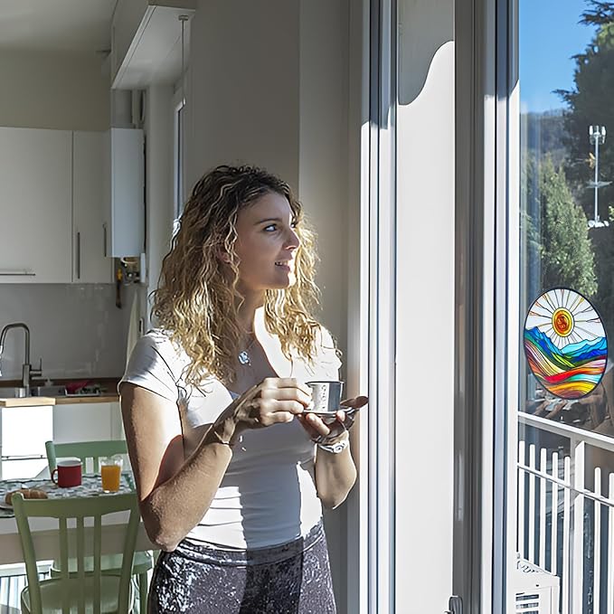 - 【stained Glass Window Hanging】This is a very beautiful artistic colorful sunrise suncatcher with a size of 6x6 inches which is perfect for windows, adding a touch of color without obstructing the view outside. This piece of glass was cut individually and painted by hand. It is skillfully handmade, and it is real glass, NOT plastic or acrylic.