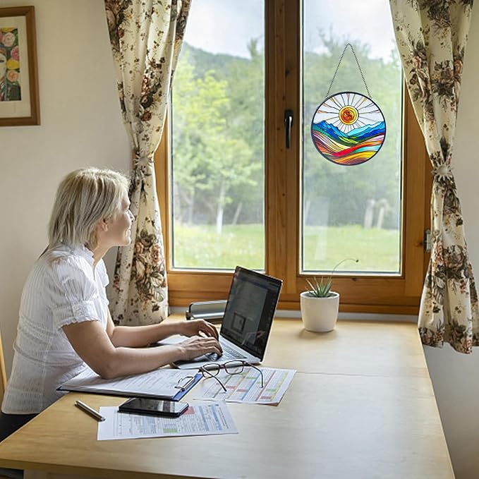 Artistic Colorful Sunrise Stained Glass Suncatcher - Window Wall Hanging Ornament Hand-Painted Glass Panel Sun Catcher - Decoration for Home Garden Christmas Party Wedding Housewarming Gifts