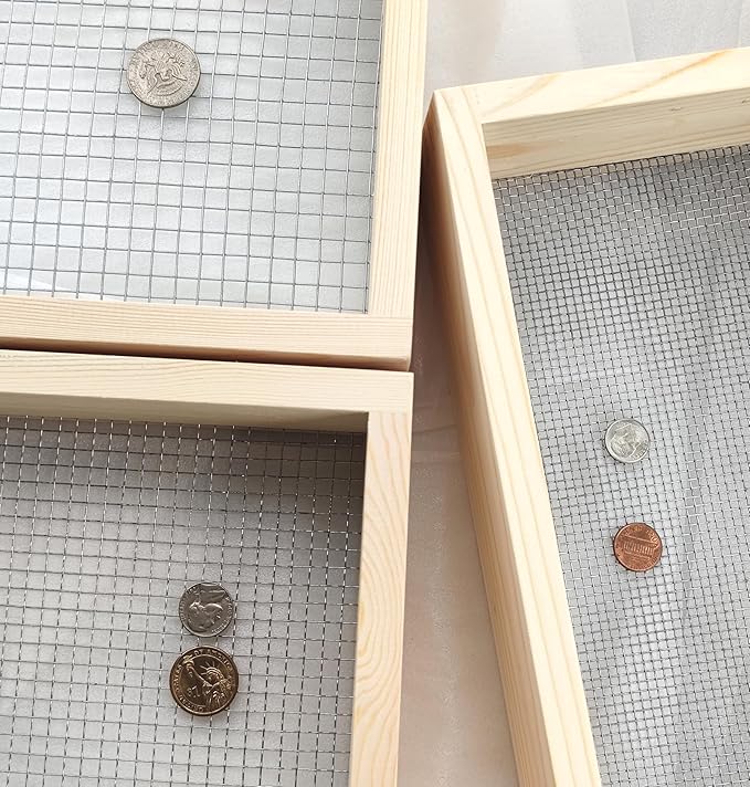 - 3 Pcs sifter Size about:15.7" x 11.8" x 3.15" /hole diameters 0.37", 14.2" x 10.3" x 3.15"/hole diameters 0.25" and 13" x 8.3" x 3.15" /hole diameters 0.12".