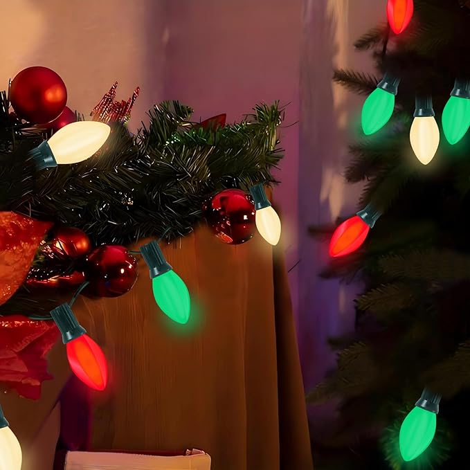 - Energy-Efficient C7 LED Bulbs: C7 vintage christmas string lights includes 27 high-quality, energy-efficient red green and white bulbs that provide bright, cheerful colors. C7 LED multicolor bulb is 0.6W, LED bulbs use less energy than traditional incandescent bulbs while providing bright and vibrant illumination, helping you save on energy costs during the holiday season. outdoor lights designed to last for years without fading, ensuring your decorations remain vibrant and eye-catching.