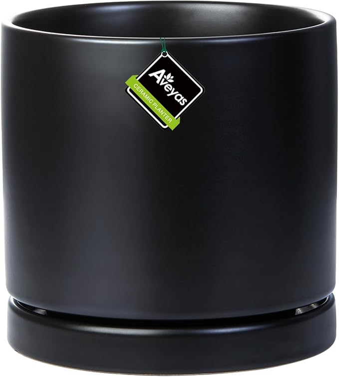 Aveyas 6 inch Ceramic Plant Pot with Drainage Hole and Saucer - Suitable for Indoor and Outdoor Use, Modern Planters for House Garden Orchid Flower Snake Monstera Plants (6", Matte Black)