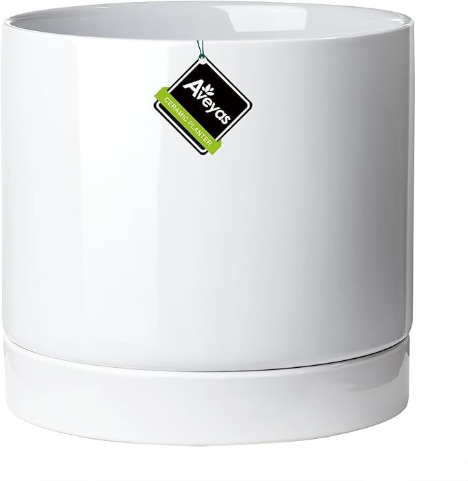 Aveyas 10 inch Ceramic Plant Pot with Drainage Hole and Saucer - Suitable for Indoor and Outdoor Use, Modern Planters for House Garden Flower Tree Snake Monstera Plants (10", Glossy White)