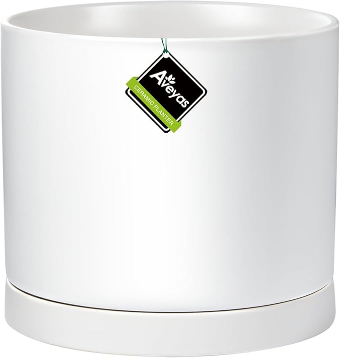 Aveyas 8 inch Ceramic Plant Pot with Drainage Hole and Saucer - Suitable for Indoor and Outdoor Use, Modern Planters for House Garden Flower Tree Snake Monstera Plants (8", Matte White)