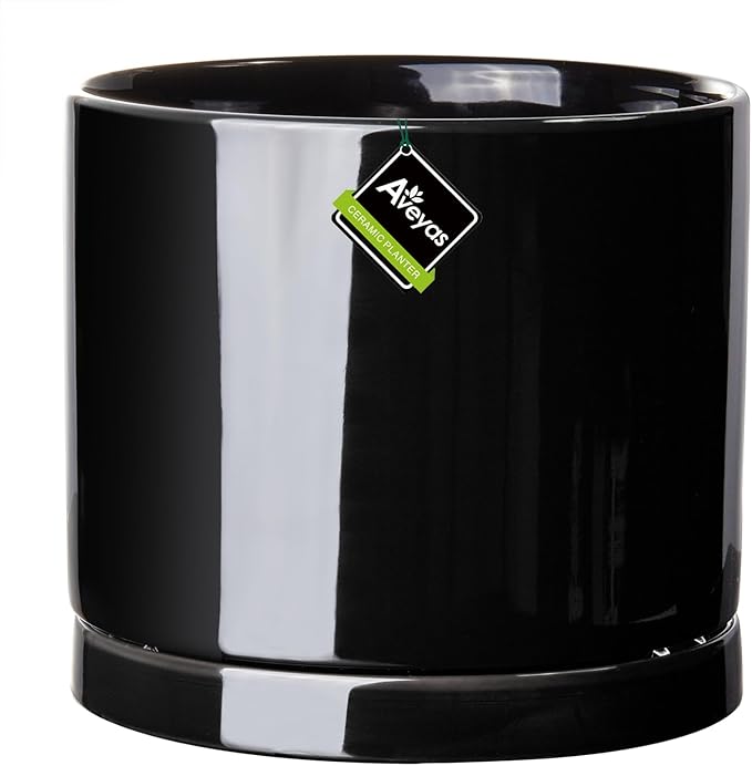 Aveyas 8 inch Ceramic Plant Pot with Drainage Hole and Saucer - Suitable for Indoor and Outdoor Use, Modern Planters for House Garden Flower Tree Snake Monstera Plants (8", Glossy Black)