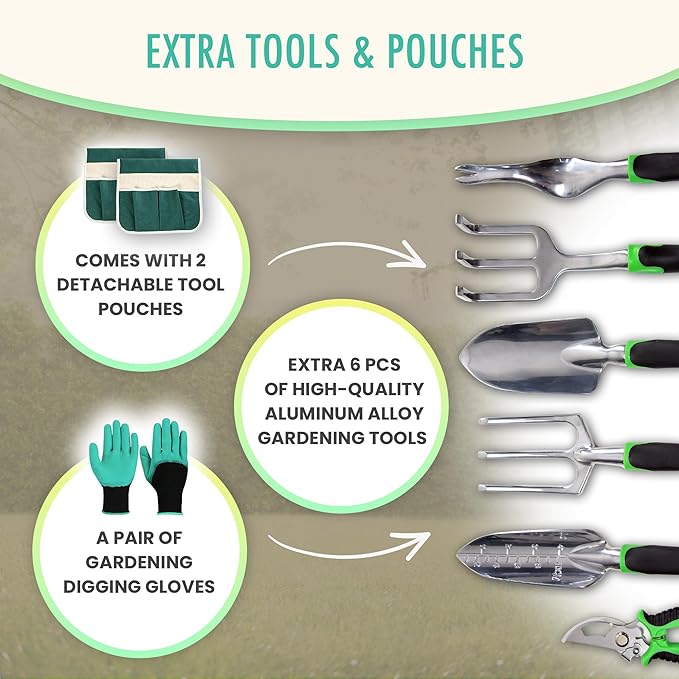 - 🌻 Complete Tool Set and Extra Storage Bags: Everything you need in one place! This seat comes with 2 detachable tool bags to keep your tools within easy reach, a pair of special digging gloves, and a 6-piece set of high-quality gardening tools. It includes everything: transplanting trowels, rake, weeder, pruner, and more, so you can dig, loosen soil, remove weeds, and prune effortlessly.