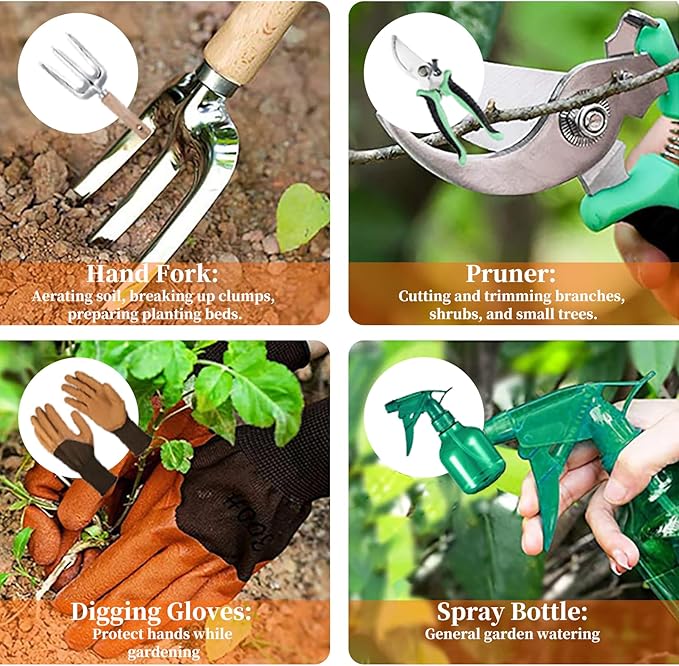 - Organize All in One Pack: The garden tools set includes 9 handy tools including pruning shears, weedier, transplanter, cultivator, hand fork, hand rake, sprayer, garden gloves. And 1 storage bag that holds everything in.
