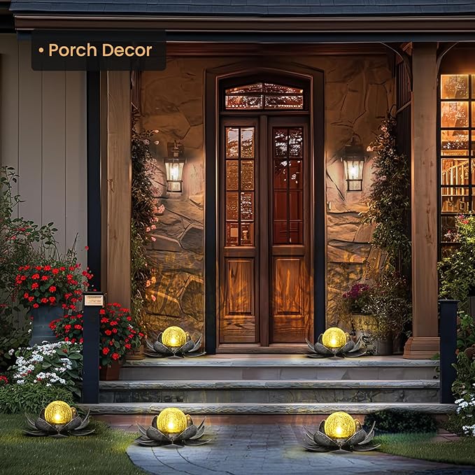 - ☔️【Weatherproof Material】☔️This outdoor solar lotus light with metal petals and crackle glass ball is made of sturdy metal with UV-resistant paint, which makes it possible to keep long-lasting performance in most weather conditions, including sunny days, rainy nights, and light snowy days.