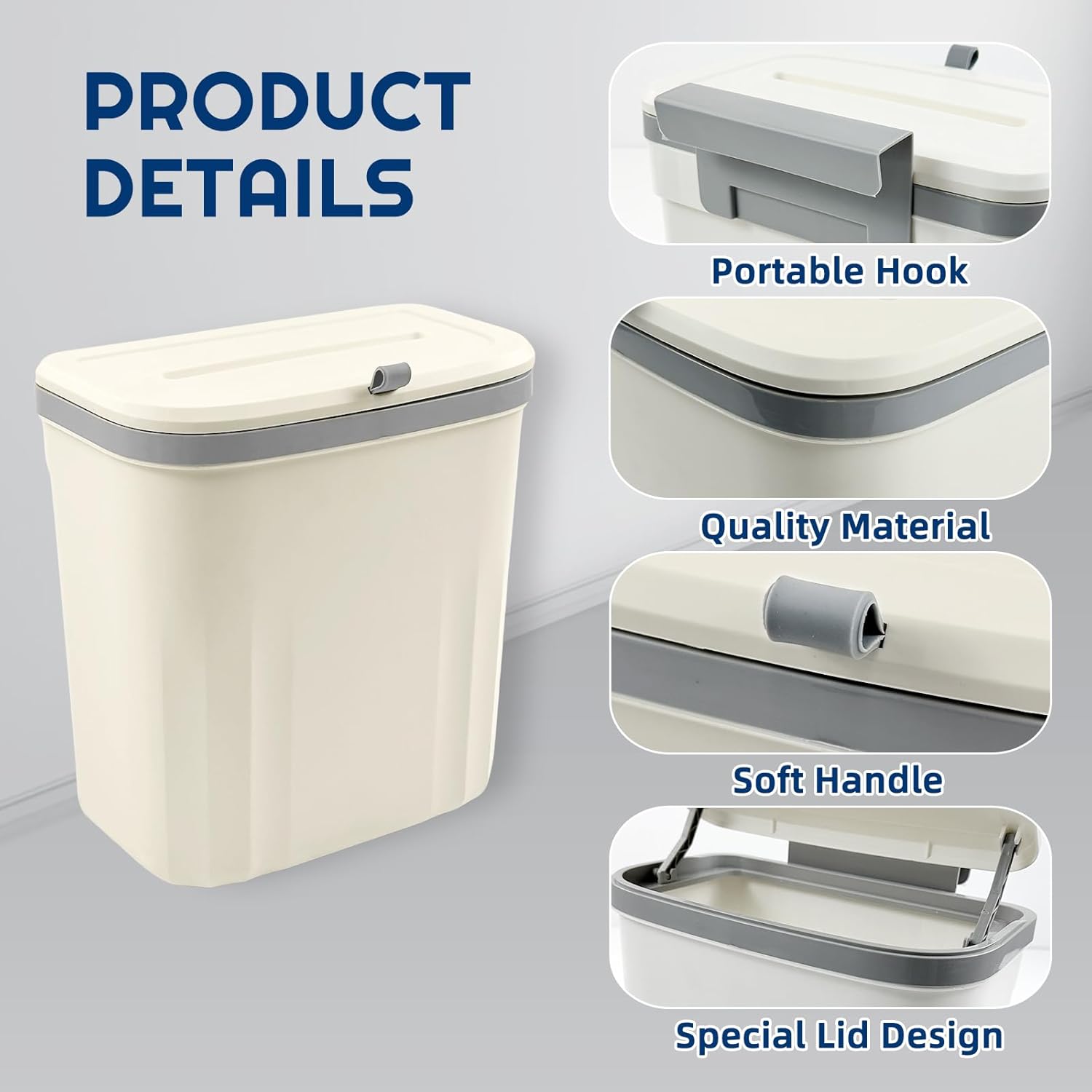 - ✅KITCHEN TRASH CAN: The hanging trash bin measures 10.6*6.1*10 inches and has a capacity of 2.6 gallons. The bin does not take up much countertop space. It can be placed on the countertop, under the sink or in the pantry, perfect for living spaces such as dorms, flats, RVs, cabins and campers.