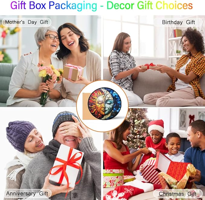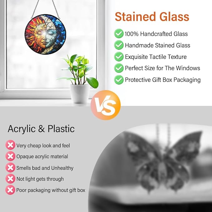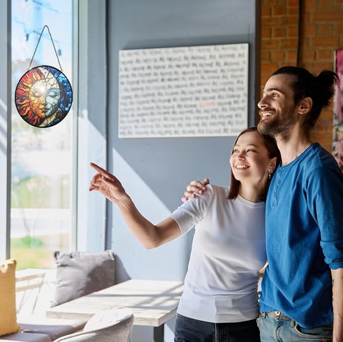 - 【Easy Installation Home Decor】The suncatcher stained glass is suitable for hanging on windows, walls, or anywhere you desire. It comes with an a metal chain for quick and easy hanging. With the metal chain, it is even more convenient to place it wherever you want, so you can effortlessly enjoy the beauty of your moon and sun stained glass window hanging.