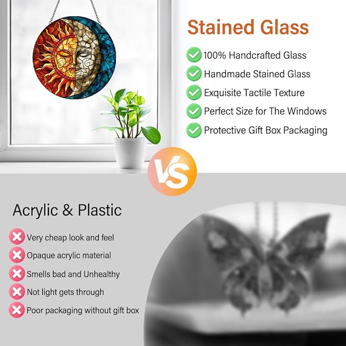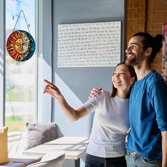 - 【Easy Installation Home Decor】The suncatcher stained glass is suitable for hanging on windows, walls, or anywhere you desire. It comes with an a metal chain for quick and easy hanging. With the metal chain, it is even more convenient to place it wherever you want, so you can effortlessly enjoy the beauty of your sun and moon stained glass window hanging.