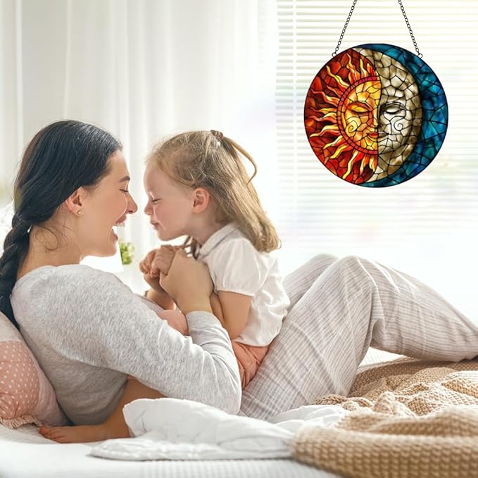 - 【Exquisite Festival Gift Memorial】The handmade suncatcher for hanging stained glass is a lovely gift for your mother, daughter, friends, family, lover or nature enthusiast, can be decor glass doors, kitchen windows, upstairs windows, round top windows, front windows, bedroom windows, kitchen doors, our sun and moon room decor panel would be a great embellishment to your home. Suitable for Mother's Day gifts, Christmas gifts, Thanksgiving Day gifts, Birthday gifts, Friendsgiving gifts.