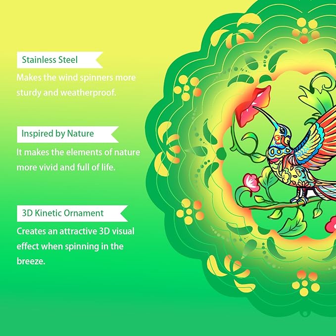 - 【3D Visual Effect】The hummingbird wind spinner adopts a colorful appearance, inspired by the animal image of a hummingbird in nature. The unique design of elements is combined with a 3D streamer effect, making it look more visual.