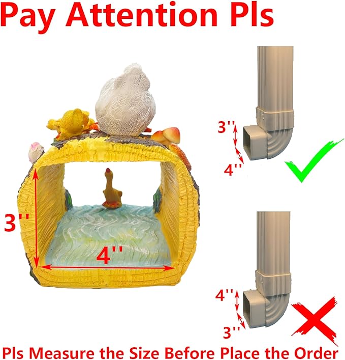 - Pay Attention The Fit Opening of Downspout Extender Decor: This charming ducks gutter downspout extension decoration measures 5.5” x 7.5” x 6.3”, fitting standard rectangular downspouts up to 3"x4". Please measure your downspout to ensure a perfect fit before placing your order.