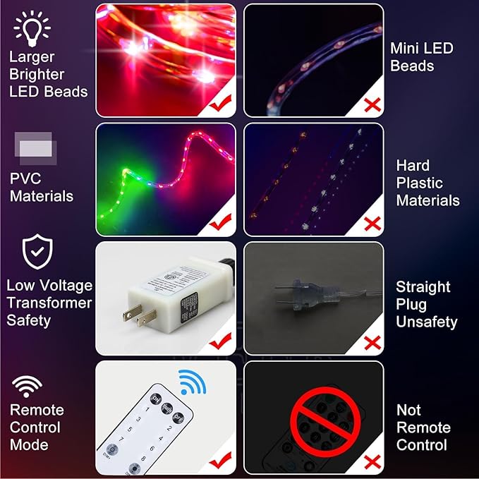- Deal with any Christmas weather: Rope lights outdoor are waterproof with PVC protection tube. Both ends are sealed to help you cope with snowy, rain and other weather outdoors during Christmas. (NOTE: The plug part is not waterproof).
