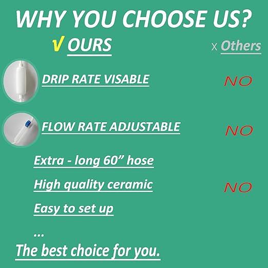 - 【How to use?】Soak the ceramic cone at least 15 minutes. Then insert the tube into the container filled with water at a high place. Pinch the drip pot and then block the water outlet in the ceramic cap. The tube will be in a vacuum state. Slowly release the drip pot and water will flow into tube due to pressure. Release the ceramic cap to let water flow out. Slide the regulator to adjut the water flow, then cover the cap on the soaked cone. Finally insert the ceramic cone into the soil.