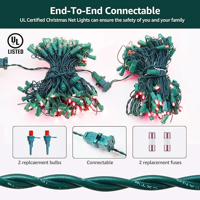 - UL Certified Outdoor Christmas Lights: Strictly tested and meets the US requirements of string lights UL standards to ensure & maximize the safety. Whole set string lights including string wire, Led bulbs and plug have been certified by UL. With our 120LED 6ftx4ft net lights, perfect outdoor indoor decorations for Christmas, Thanksgiving, Easter, Halloween, party, yard, balcony, garden, pergola, gazebo, especially for trees and bushes.