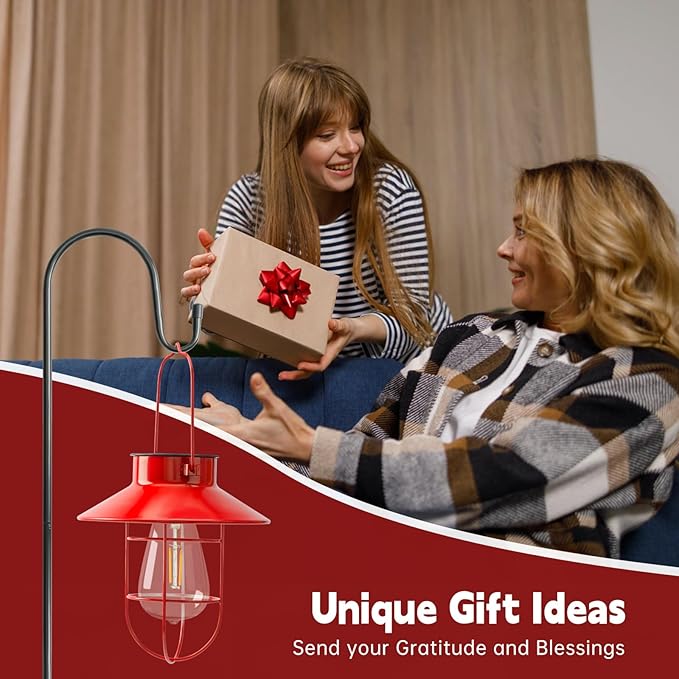 Solar Lantern with Shepherd Hook, Solar Lights Lantern lamp, Outdoor Lights Decor, Water Resistant Edison Bulb Lights for Garden Decor ,Outside Decor for Pathways,Patio, Lawn or Yard (Red,2 Pack)