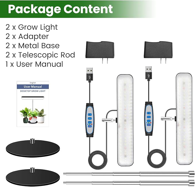 Grow Light, Full Spectrum Desktop Plant Lights for Indoor Growing 2 Pack Black, Large Area Lighting LED Grow Lights with Base, Height Adjustable 7.8 to 26 Inch Plant Lamp with 6/12/16H Timer