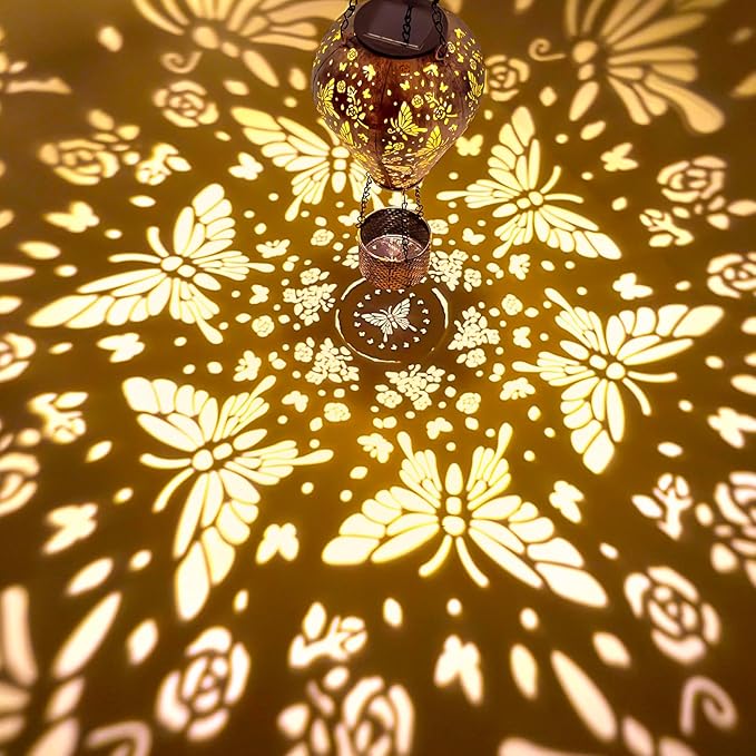 - 【Butterfly Pattern】The Profinella hot air balloon solar lantern features a unique metal butterfly cut-out pattern design. During the day, it serves as an art ornament to enhance your garden, yard or outdoor space; at night, it transforms into a magical light show, projecting clear butterfly patterns onto the ground or walls, adding endless charm to your outdoor decor.