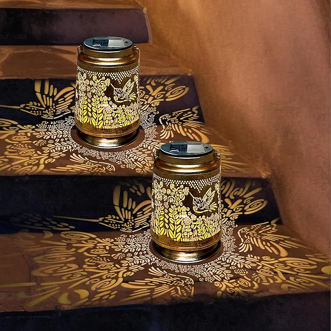 - [Perfect Garden Decorative]: Hummingbird solar lanterns outdoor camping waterproof lights adopts hollow out design and monarch butterfly pattern,with Bronze Color and hollow out metal veneer, the solar outdoor lanterns casts bright and warm light in darkness, Solar lanterns could project beautiful patterns, creating a gorgeous and warm atmosphere. Perfect for decorations for garden,patio,lawn,backyards,yard, porch, pathway, walkway, terrace, balcony , twinkling tree, placed on the tabletop or on the ground and many other scenes.When lit at night, adding a touch of color to your garden.Size:6.00"H x 4.5"W x 4.5"L.