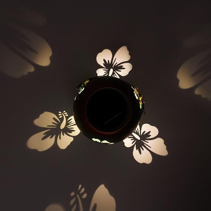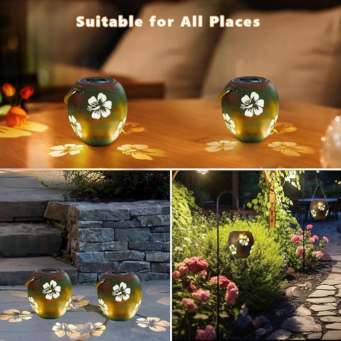 - Hollow Out Desgin: The 2 pack solar lanterns outdoor have a vintage copper green color with hollowed out flower pattern. When light is turned on, outdoor lantern can cast flower shadows around it, making it look vibrant and alive
