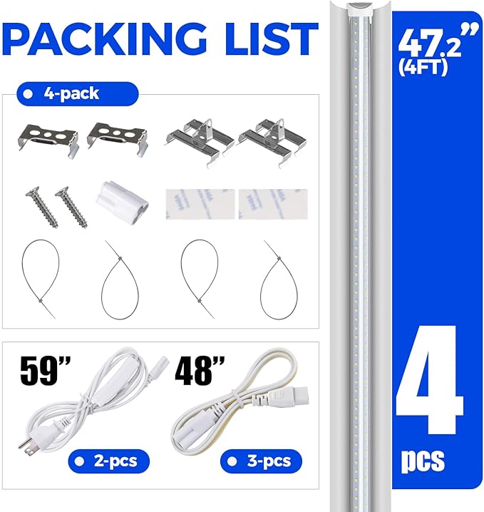 - What You Get: 4 x Barrina LED Grow lights, 2 x Power cords with ON/OFF switch, 3 x Connecting Cords(48"), 4 x Small Connectors, 16x Installation Clips, 8 x Double-sided tape, 16 x cable ties