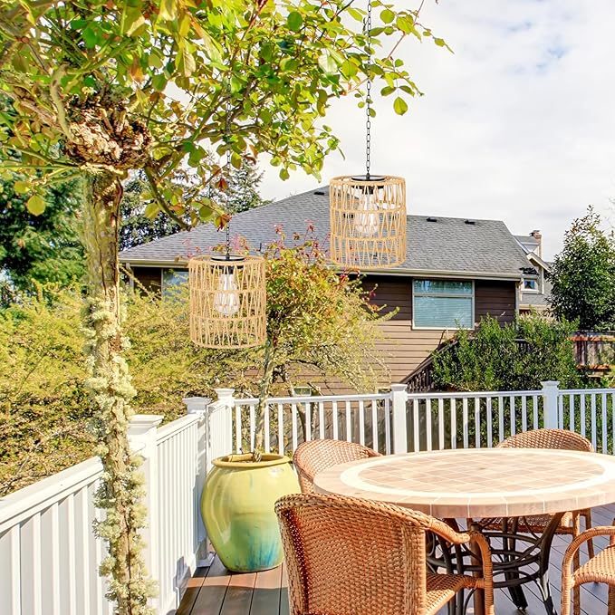 - 【Outdoors Hanging Lanterns】pendant light made of rattan and containing a retro Edison bulb,The elegance lighting creating a natural and coastal beach feel through weaving spaces,Its charming openwork pattern and subtle glow illuminate your patio in a special way, adding more nature to your garden.MAINLY FOR DECORATION, NOT FOR ILLUMINATION.