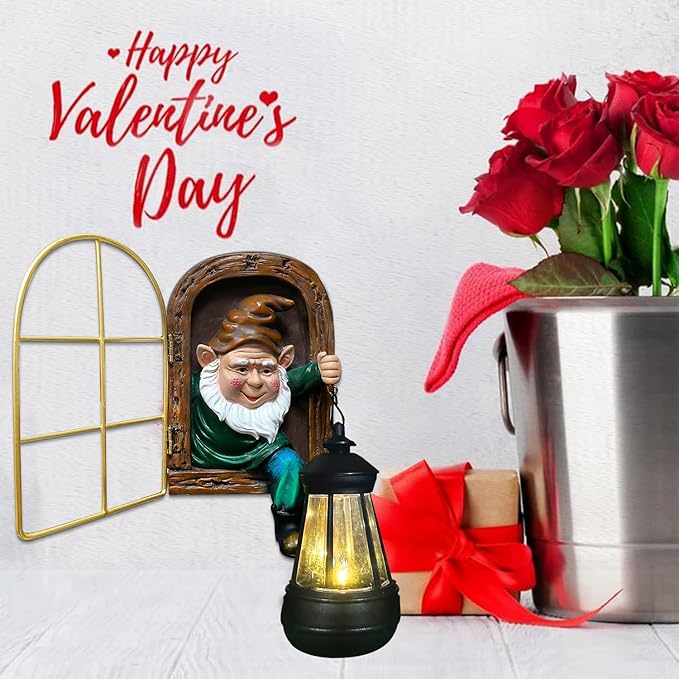 - 【Easily Assemble Whimsical Tree Decor】 - This tree faces decor outdoor is depicted as if the curious little old man with white beards is climbing out of a window to see something interesting, holding a small shining solar lantern. You can hang this gnome garden decor on your favorite tree, wall or fence with 3 keyhole brackets on the back and 3 screws provided to ensure it stay securely in place. The swinging window and soft lighting effect bring you a visual appeal and realism.