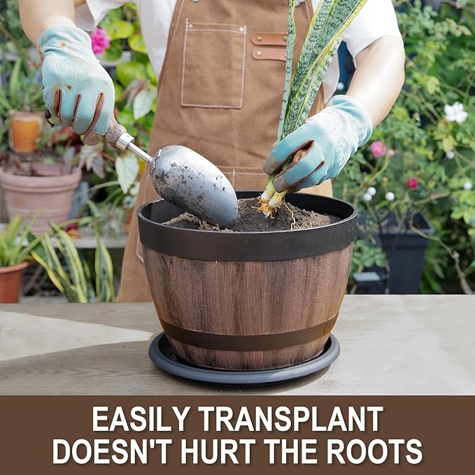 6 Pack Plant Pots with Drainage Holes, Include 2 Each of 16/12/9 inches Flower Pots with Saucers, Plastic Imitation Wine Barrel Design for Indoor Outdoor Garden Home Plants