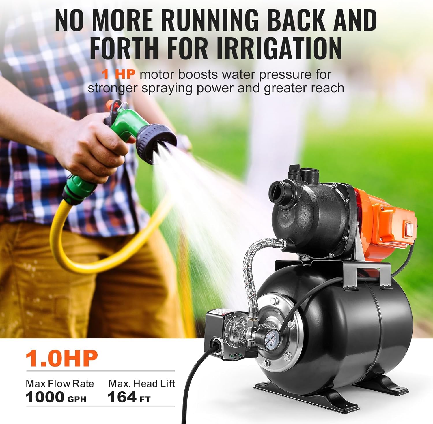 VEVOR 1 HP Shallow Well Pump with Pressure Tank, 1000 GPH/3700 L/H, Automatic Irrigation Water Booster Pump with 164 ft Lift 20/40 PSI Pressure Switch, Thermoplastic Pump Head for Home Garden Lawn