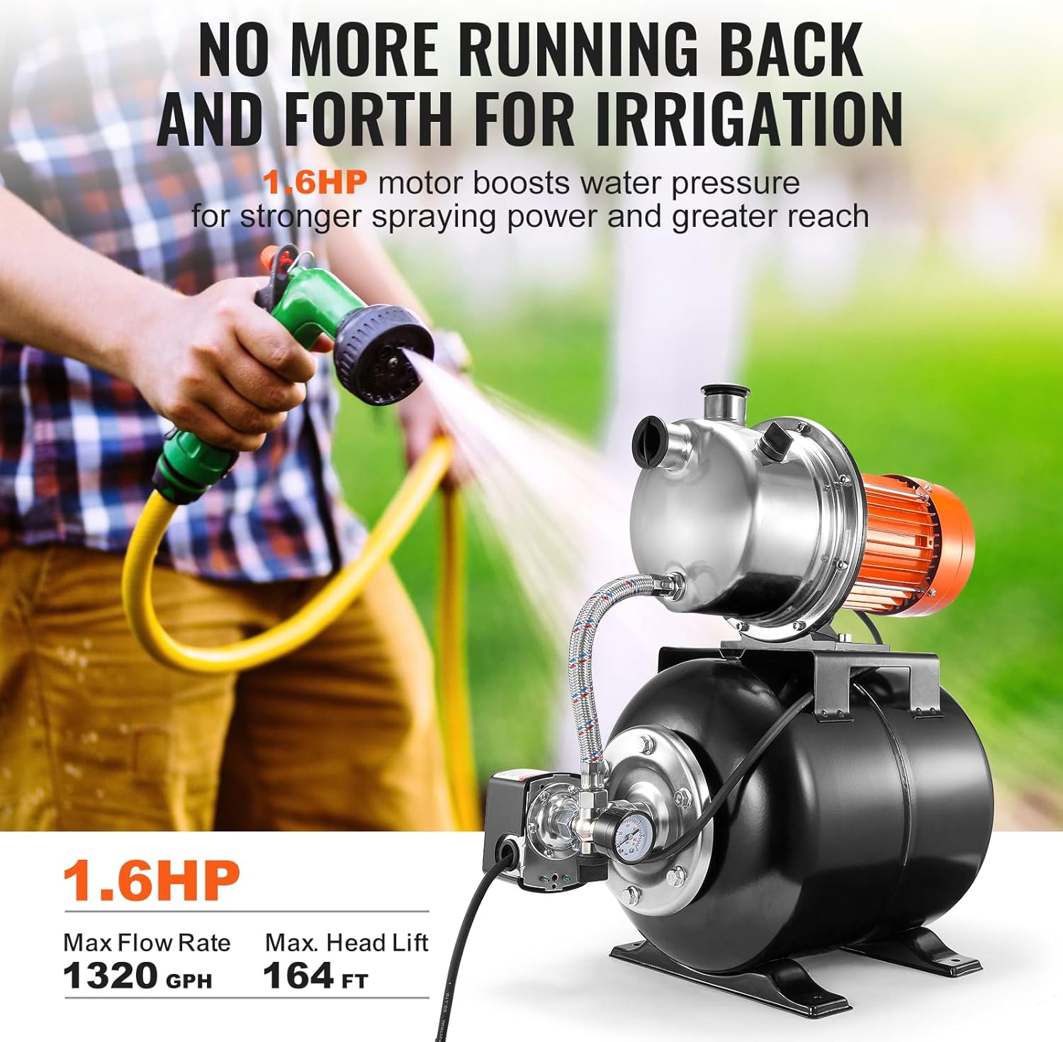 - High-Efficiency Water Transfer: Equipped with a 1.6HP (1176W) motor, our shallow well pump with pressure tank delivers a maximum flow rate of 1320 GPH (5600 L/H), a head lift of up to 164 FT (50 M), and a suction depth of 26.3 FT (8 M). Ideal for long-distance water delivery with impressive efficiency.