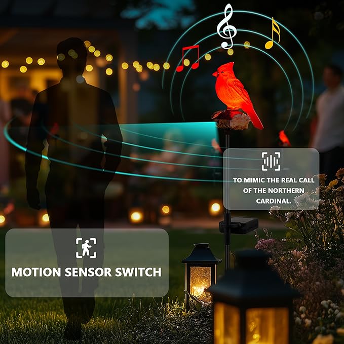 - Simulated Bird Call: Using motion control system. When people pass by or come close to this cardinal statue, the bird song will sound. If in night, the solar light will flash at the same time. Suitable for outdoor display, enhancing any space with a touch of nature and vibrancy.