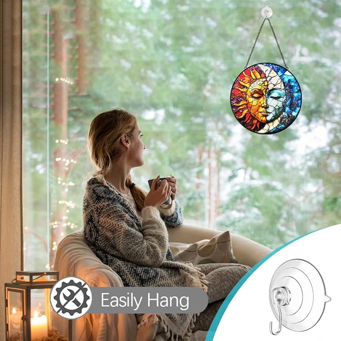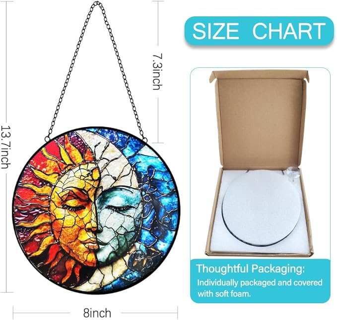 - Glass Window Decorations: The upgraded large-size glass hanging panels bring you a new decorative experience. This is a very beautiful moon and sun suncatchers, size is 8 inches which is perfect for any windows or wall space. Stained glass window hanging is the right size to enhance your home decor without blocking the view, it is a good choice for decorating a house