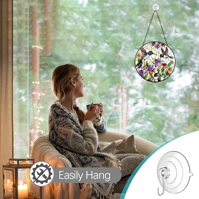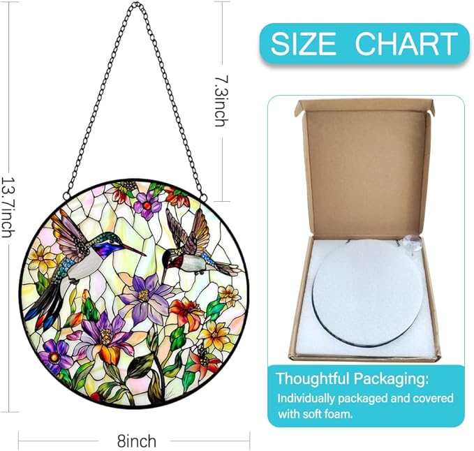 - Glass Art Window Decorations: The upgraded large-size stained glass hanging panels bring you a new decorative experience. This is a very beautiful hummingbird sun catcher hanging, size is 8 inches which is perfect for any windows, wall or garden space. Stain glass window hanging is the right size to enhance your home decor without blocking the view, it is a good choice for decorating a house
