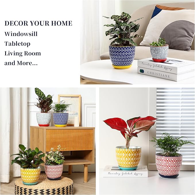 - 【GOOD QUALITY & EASY CLEANUP】These flower pots are fired at high temperatures to ensure they can withstand prolonged exposure to wind and sunlight without deformed, faded, or paint off. The complete smooth texture inner & outside makes clean a breeze. Let the indoor pots for plant always look fresh and new.