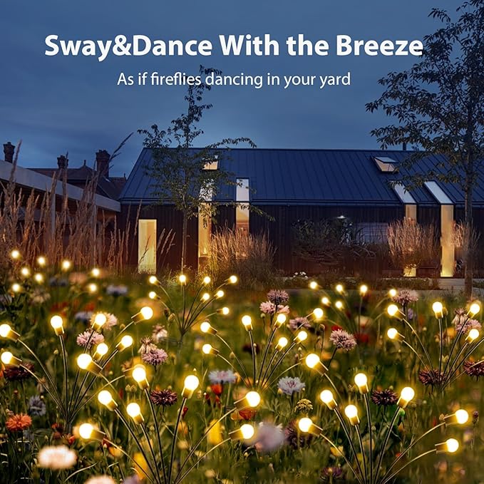 - Newly Upgraded Design, Beautiful Solar Garden Lights for Christmas Ambience: This solar garden lights are designed with flexible branches and bright LED bulbs, which can sway and dance with the wind and looks like fireflies flying in the yard. The outdoor solar lights have 2 lighting modes ( Steady On and Flash Mode) which can add a lot of vitality to your garden, and create a romantic atmosphere.