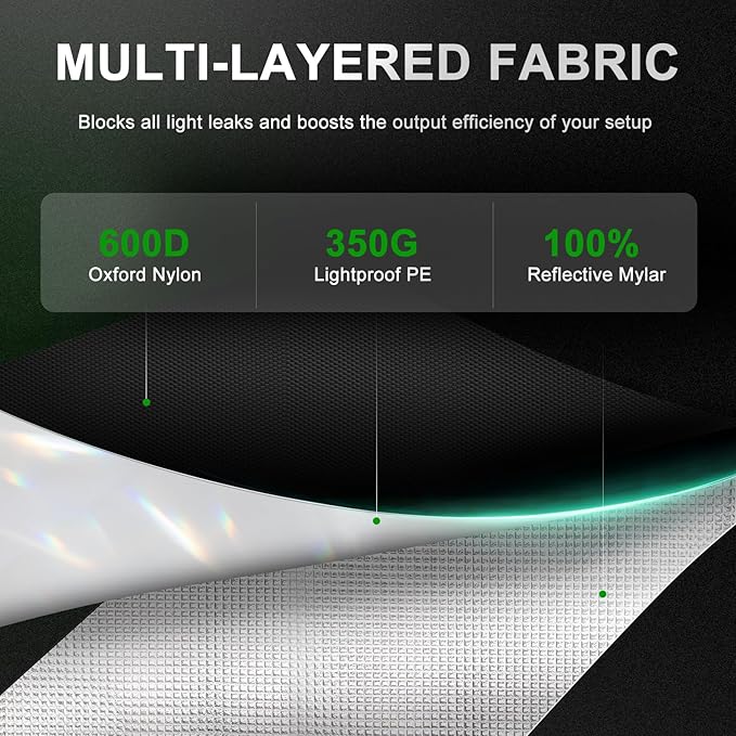 - 【Highly Reflective Interior】: The grow tent uses a highly reflective waterproof polyester film lining to effectively utilize every beam of light. It can be matched with your growing lamps and equipment to maximize the utilization of light, so that your plants can get enough light, maintain stable temperature and humidity, and achieve healthy growth of plants.