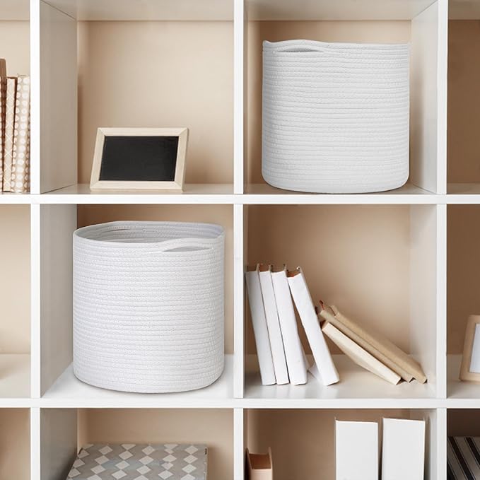 Cotton Rope Plant Basket, Woven Basket Planter for 10 inch Pot, Round Indoor Tree Pot Cover, Small Storage Bin Organizer, Basket for Plants and Home Decor, 11”X11”, White