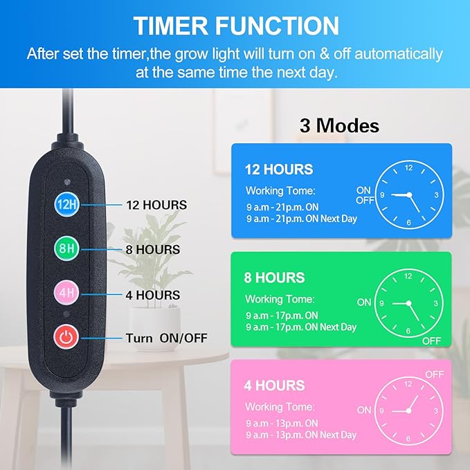 - Timer for Auto On/Off Plant Grow Light---4/8/12H Timer Grow Lights for Indoor Plants. Auto On/Off Every Day Just as You Need.