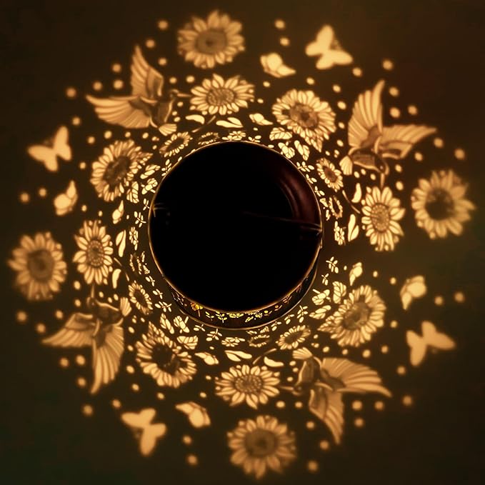 - Stylish Pattern Design: Our outdoor solar lanterns feature stylish and beautiful Hummingbird and sunflower patterns. Whether you hang the lantern on a tree or place it on a flat surface, it will cast charming patterns around. The unique patterns bring a breath of nature to your outdoor space, making it more inviting and visually appealing.There is the switch ON/OFF on the lantern cover, please make sure to Press the Button before charging.