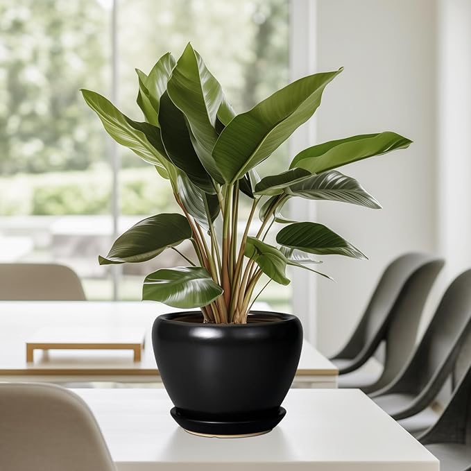 Ceramic Planter Pot - 6 Inch Plant Pot with Drainage Hole and Saucer Round Planter for Indoor Plants Outdoor Succulent Pot Modern Flower Pot for Home Decor Black