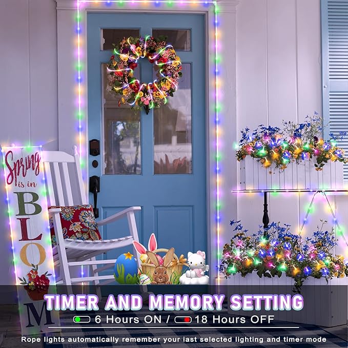 - 【Connectable Easter Rope Lights】- Our upgraded led rope lights feature has 66ft lighting length, 6.6ft lead wire, total 72.6ft length. And the spacing between each LED bead is 4 inches, the light is bright but not harsh. The rope lights indoor can be connected end to end up to 5 sets to illuminate your home and create a warm and romantic atmosphere!