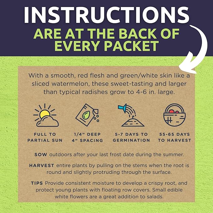 - 10 INDIVIDUAL SEED PACKETS: Cherry Belle Radish, Daikon Radish, Easter Egg Blend Radish, Runder Schwarzer Radish, Misato Rose Watermelon Radish, Pink Beauty Radish, Champion Radish, Valentines Day Blend Radish, Purple Plum Radish, French Breakfast Radish.