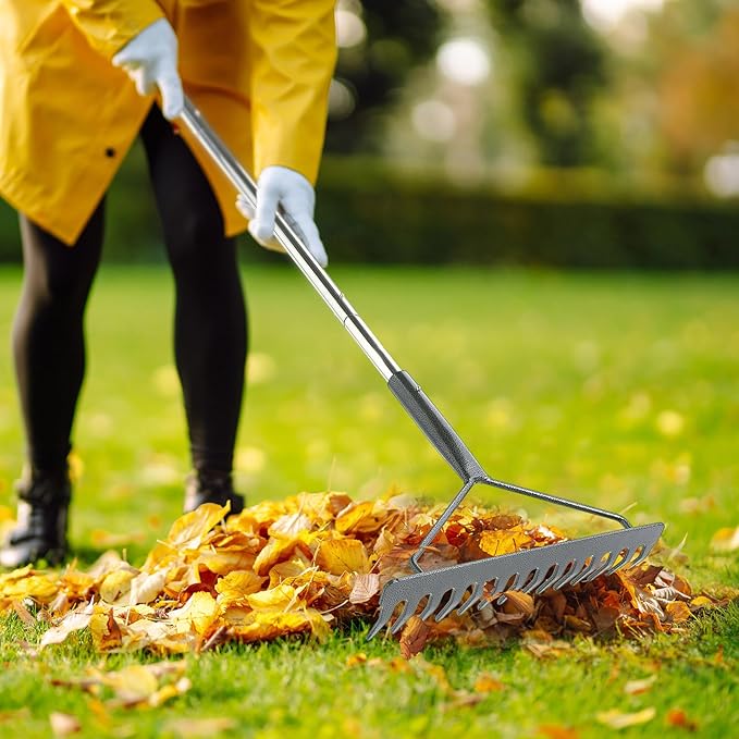 Sturdy Garden Rakes for Leaves: Metal Rake Heavy Duty Tool for Quick Clean Up of Lawn and Yard, 38’’--63’’ Adjustable Long Handle and 25Tins